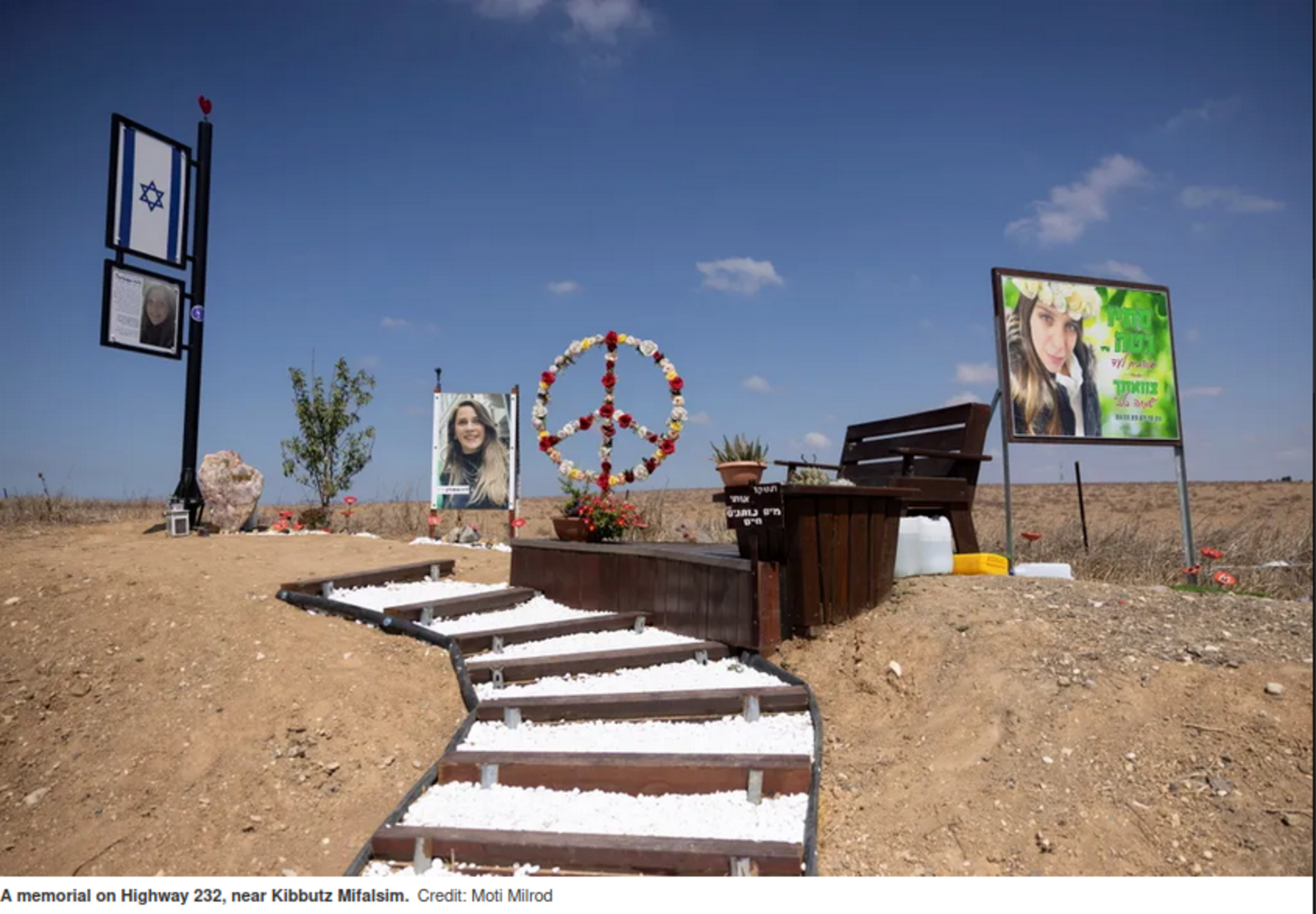 Des drapeaux jaunes en hommage aux otages de Gaza bordent la route 232, la route du sang à la frontière de la bande de Gaza, empruntée par des foules meurtrières de Hamasniks. Les dizaines de voitures brûlées ou explosées qui jonchaient les accotements ont été remplacées par d'innombrables monuments privés érigés par des membres de familles dévastées. Dans certains cas, il s'agit d'un panneau et d'une bougie, dans d'autres d'un monument coûteux et bien conçu - tous en l'honneur de jeunes gens du festival Nova qui ont tenté en vain de fuir les horreurs de la Nukhba en empruntant cette route. Il y a un nombre particulièrement important de petits mémoriaux comme celui-ci au détour du kibboutz Mifalsim. La mort était omniprésente ici.
