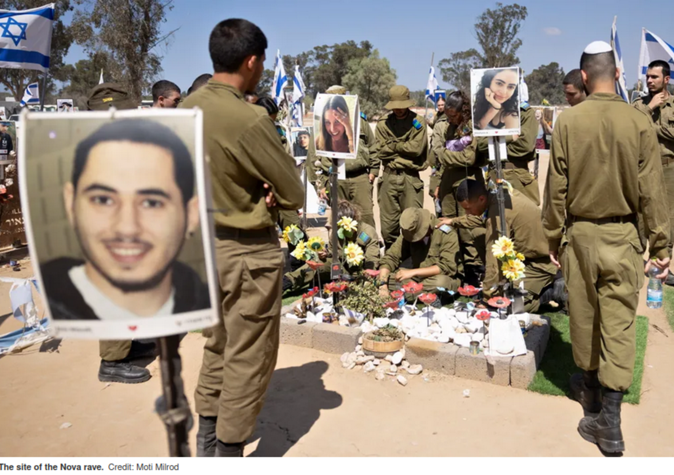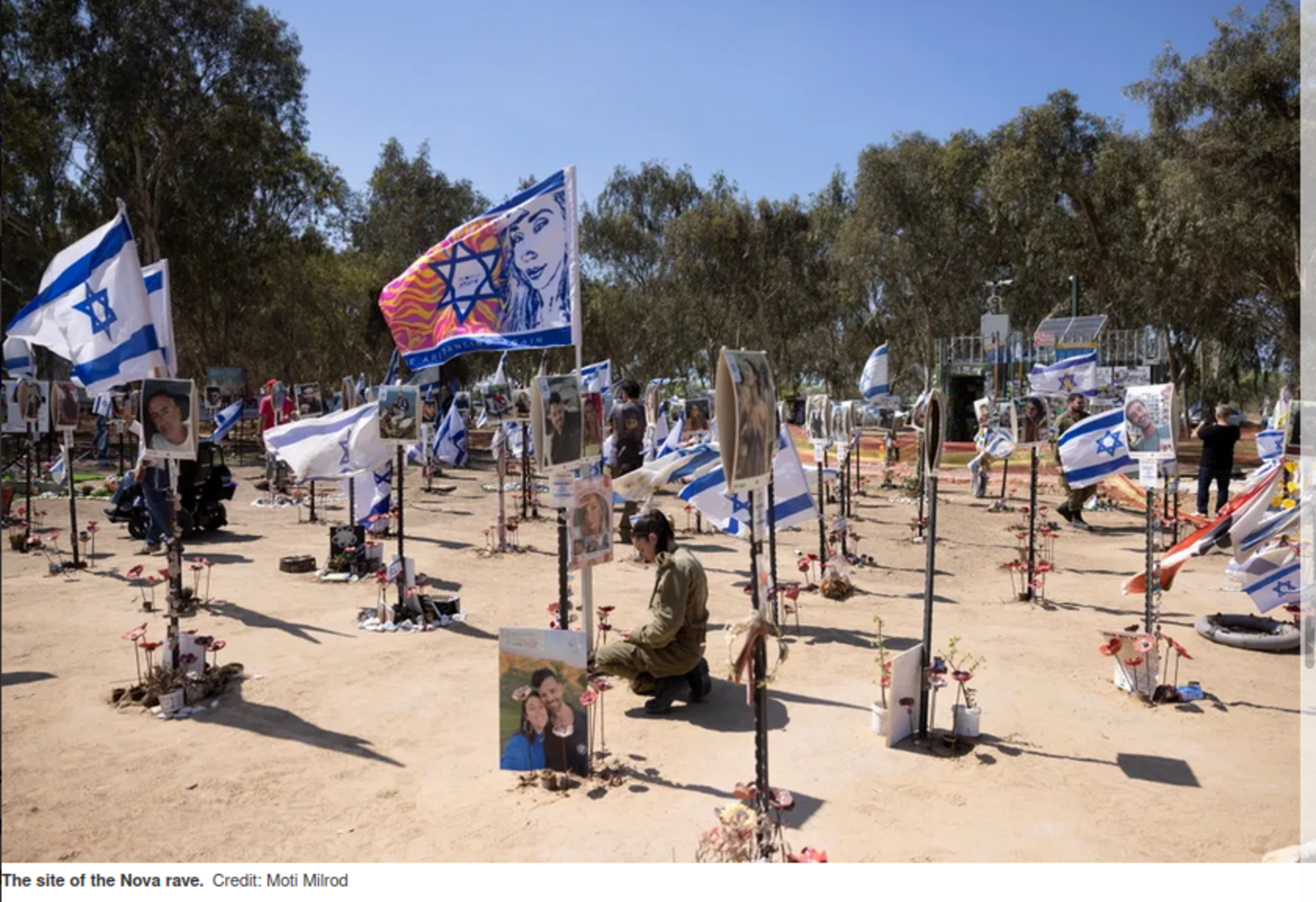 Un autre groupe est occupé à créer le drapeau Re'im, une immense installation à la mémoire de ceux qui ont été assassinés. Des ouvriers arabes pavent la route d'accès qui mène à l'endroit, lui donnant un air de chantier de Tel Aviv. « Vous êtes dans l'enceinte de Nova. Sachez que cette zone est menacée par les roquettes », prévient une affiche, rappelant que la guerre n'a rien donné jusqu'à présent. Un groupe de soldats, hommes et femmes, s'agenouille à côté de l'une des photos des personnes assassinées, allumant des bougies commémoratives, les yeux pleins de larmes.