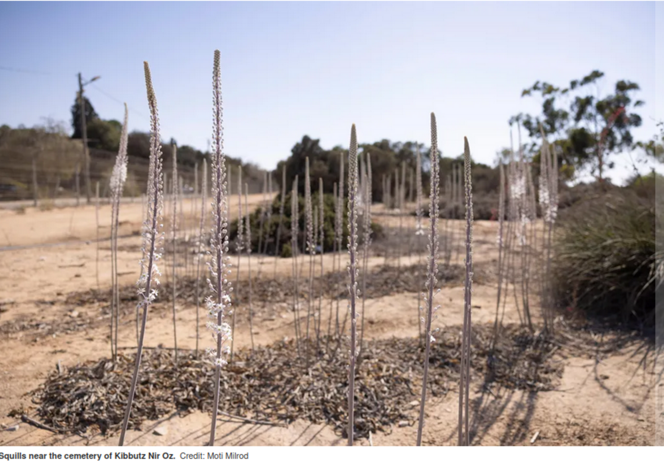 Haya nous propose d'aller voir les calamars, annonciateurs de l'automne, qui fleurissent sur le chemin du cimetière. Elle recommande également un arrêt au jardin de cactus entretenu par Oded Lifshitz, 84 ans, qui fait partie des personnes retenues en otage dans la bande de Gaza. « Nous ne voulons pas être oubliés », dit Avi alors que nous marchons le long des allées. À côté de la maison de Lifshitz, qui a été incendiée, se trouve une maison de la mort dont la démolition est prévue prochainement. Dans ce quartier, il y a eu plus de captifs que d'assassinats.