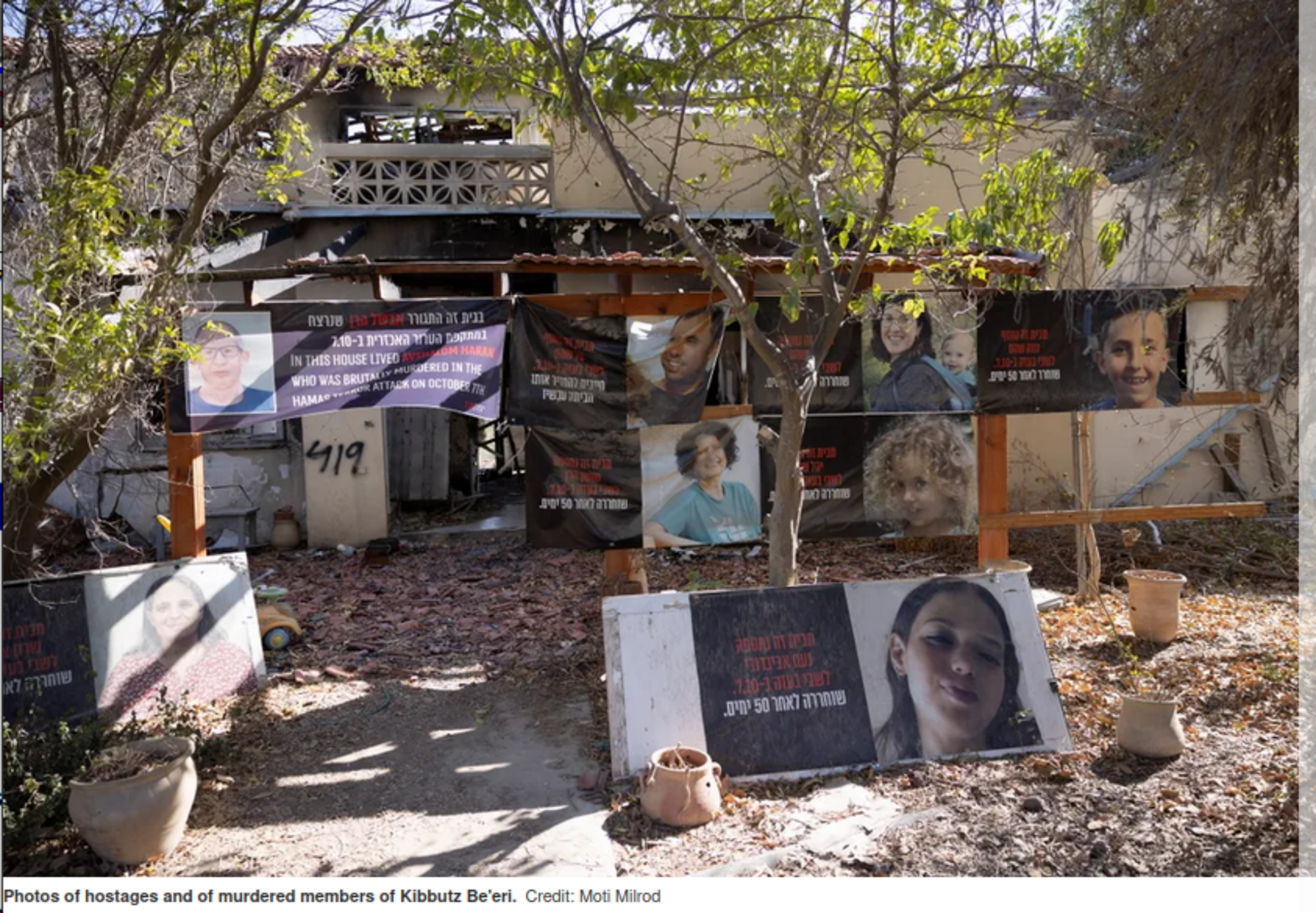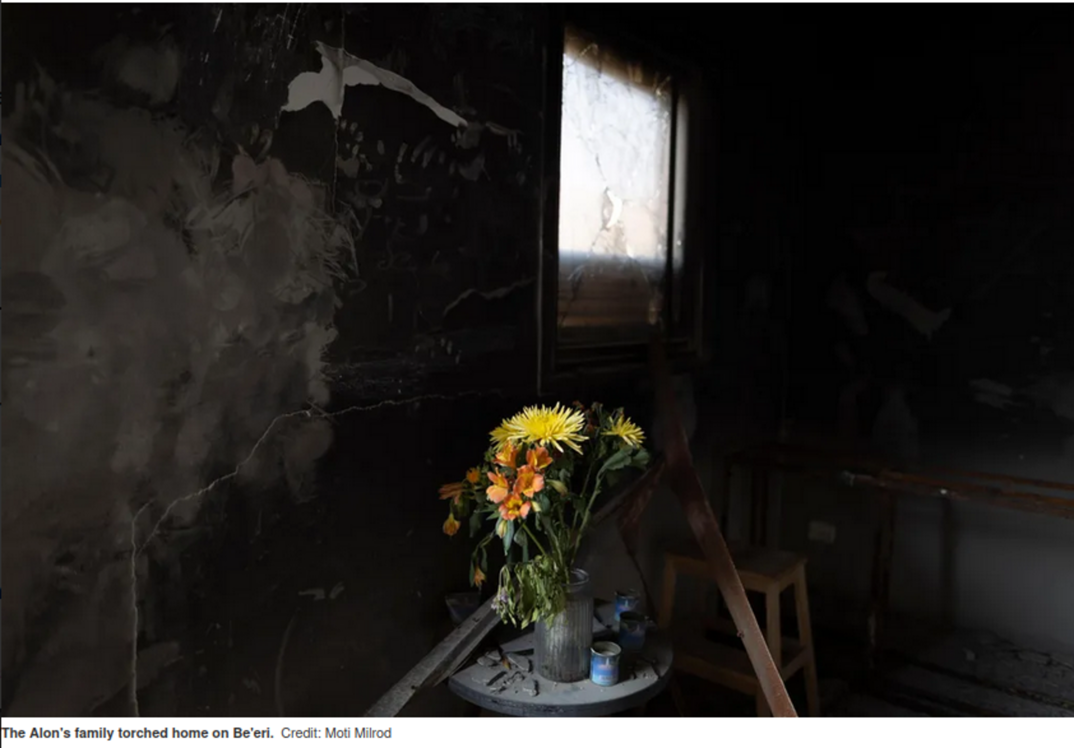 Dans le voisinage du kibboutz Be'eri, il y a maintenant des funérailles presque tous les jours. La plupart des 102 personnes qui y ont été assassinées ont d'abord été enterrées loin de là. À l'approche de leur premier yahrzeit, elles sont maintenant enterrées pour le repos éternel, l'une après l'autre. Environ 200 des 1 000 résidents sont revenus, les autres s'installent dans un nouveau quartier construit pour les réfugiés de Be'eri au kibboutz Hatzerim, où ils seront logés pendant quelques années, à l'extérieur de Be'er Sheva. Soixante-dix familles y ont déjà emménagé. Be'eri a un porte-parole et chaque visite doit être coordonnée avec lui et inclure un guide du kibboutz. Il y a également un formulaire à remplir à l'avance. Notre guide est Lior Alon, qui a passé pas moins de 16 heures dans la pièce sécurisée de sa maison incendiée le 7 octobre, avec sa femme, deux de leurs filles et un de leurs petits amis. Un séjour en enfer dont il porte les traces.