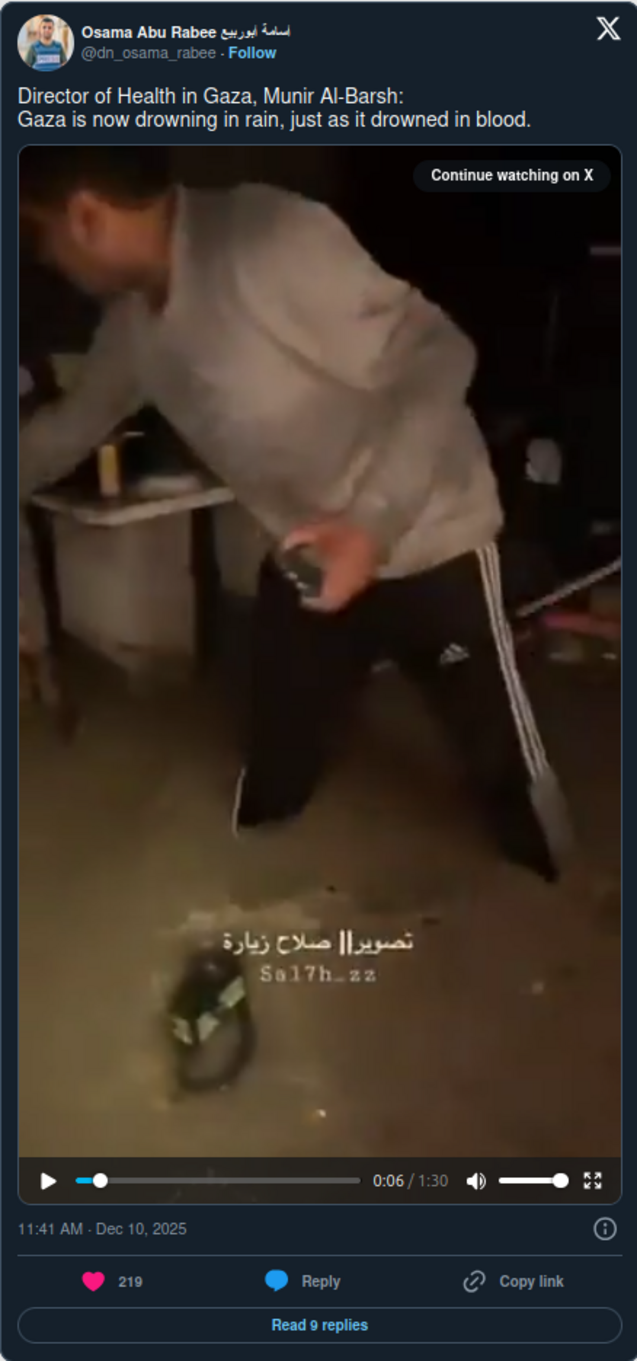 Le journaliste Moatasem A. Dalloul a publié une alerte météo sur X : « De fortes et longues pluies vont s'abattre sur Gaza dans les prochaines heures… Les personnes déplacées, dont moi-même, vivons dans des tentes en lambeaux après que l'armée israélienne a détruit nos maisons et nous a chassés de nos villes. Priez pour nous. »