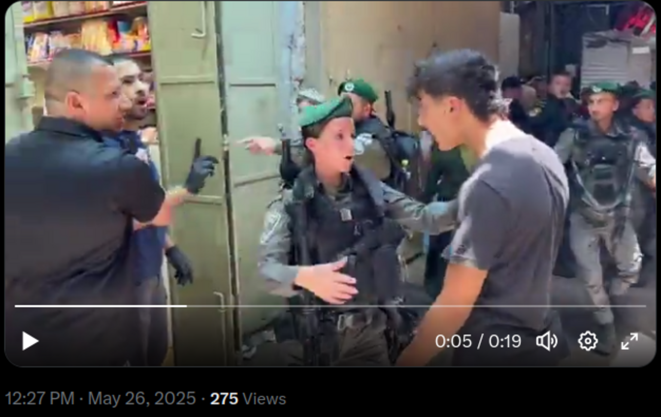 Des commerçants palestiniens harcelés par des adolescents nationalistes d'extrême droite rassemblés dans la Vieille Ville pour la marche annuelle du drapeau. La police leur ordonne de rentrer chez eux et de garder la porte fermée. Rachel Finck, compte X.