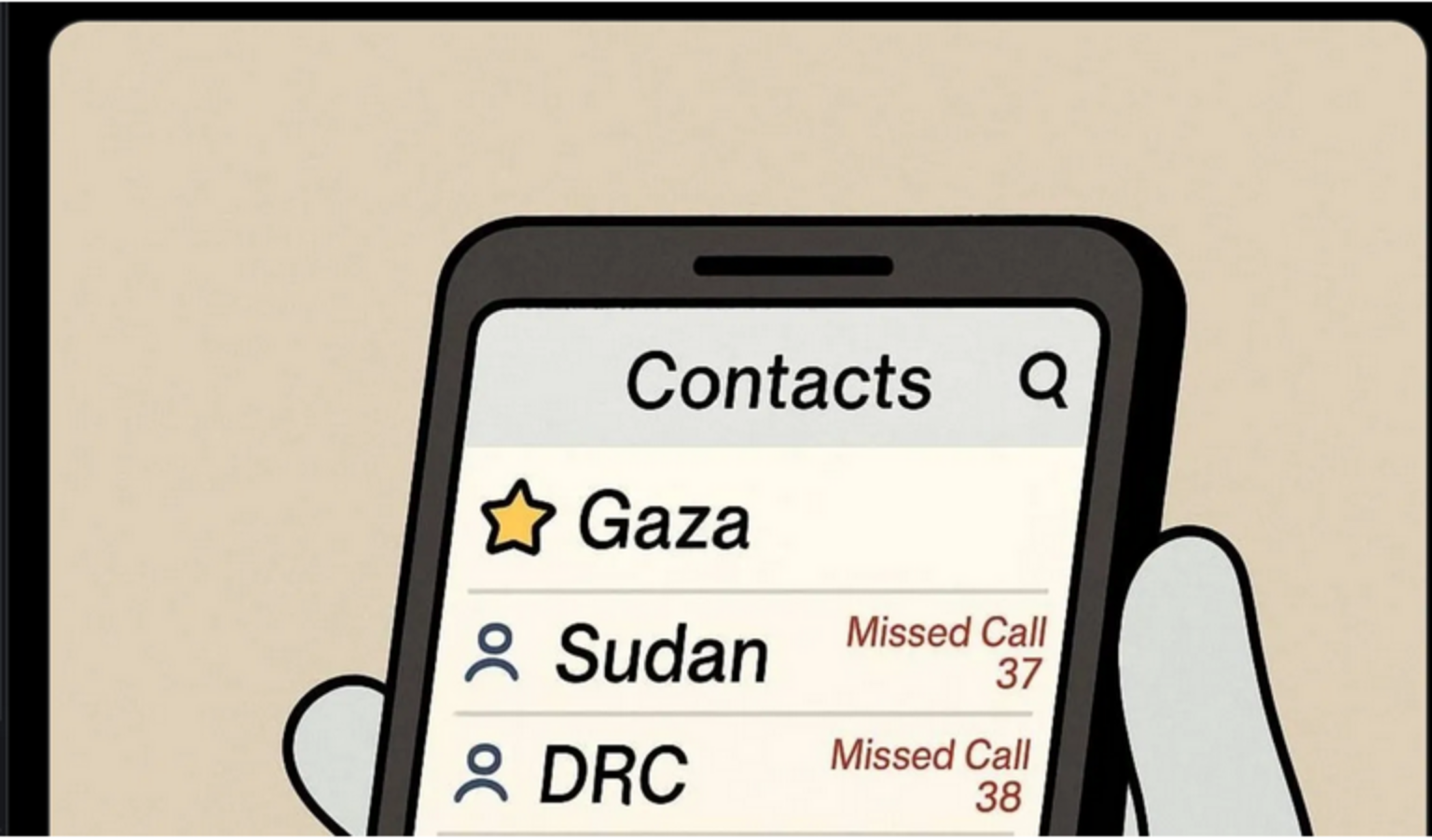 Elle montre un téléphone portable avec Gaza comme contact favori et une liste d'« appels manqués » provenant d'autres régions troublées du monde : Soudan, République démocratique du Congo, Afghanistan, Yémen.