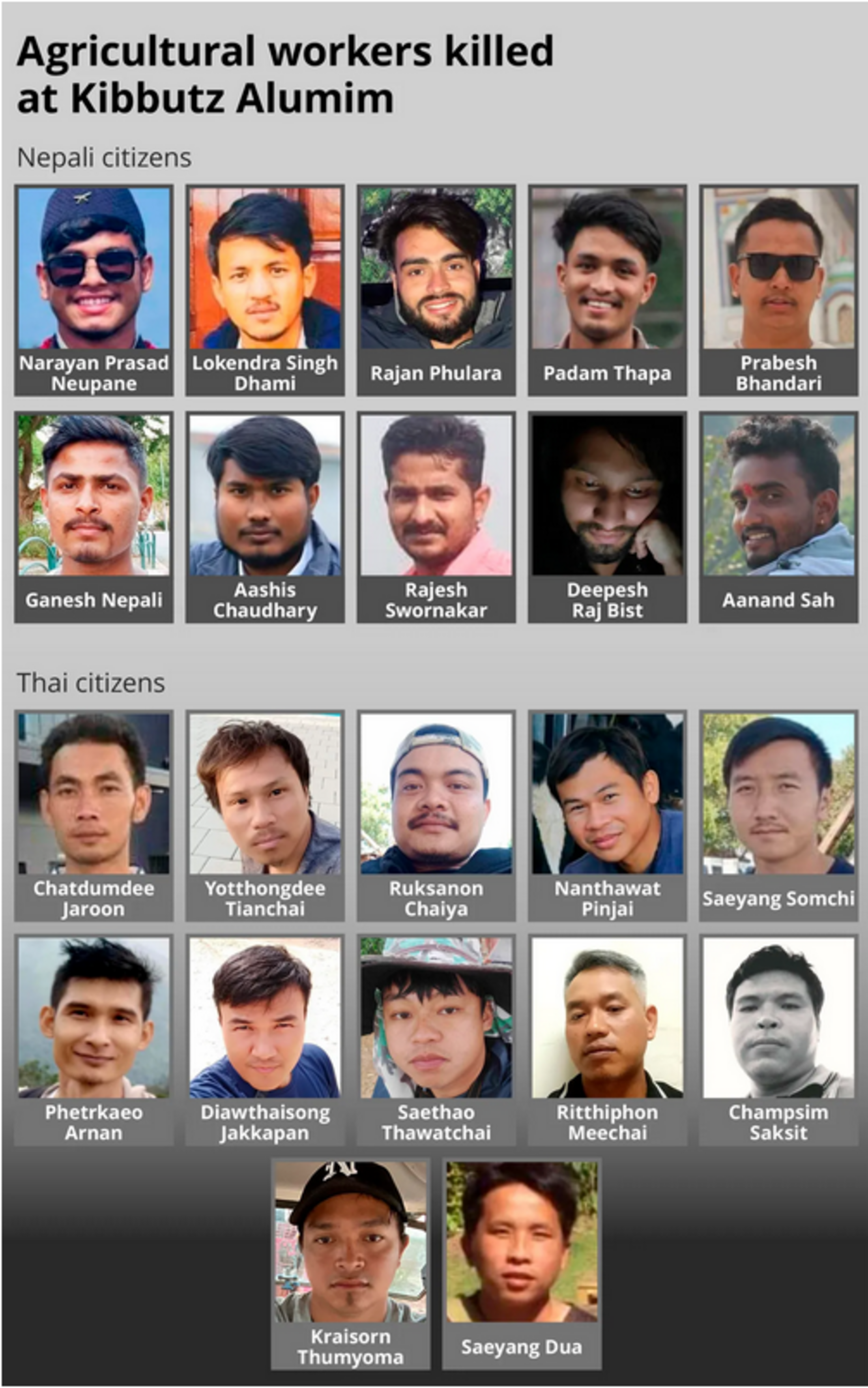 Le sort exact des travailleurs migrants qui ont été vus pour la dernière fois se cachant dans la salle à manger ou dans les quartiers d'habitation reste incertain. Peu de témoins du massacre ont survécu. Ce que l'on sait, c'est que Bipin Joshi et le travailleur thaïlandais Phonsawan Pinakalo ont été kidnappés à Alumim et emmenés à Gaza. Tous deux ont ensuite été enregistrés à l'hôpital Shifa.