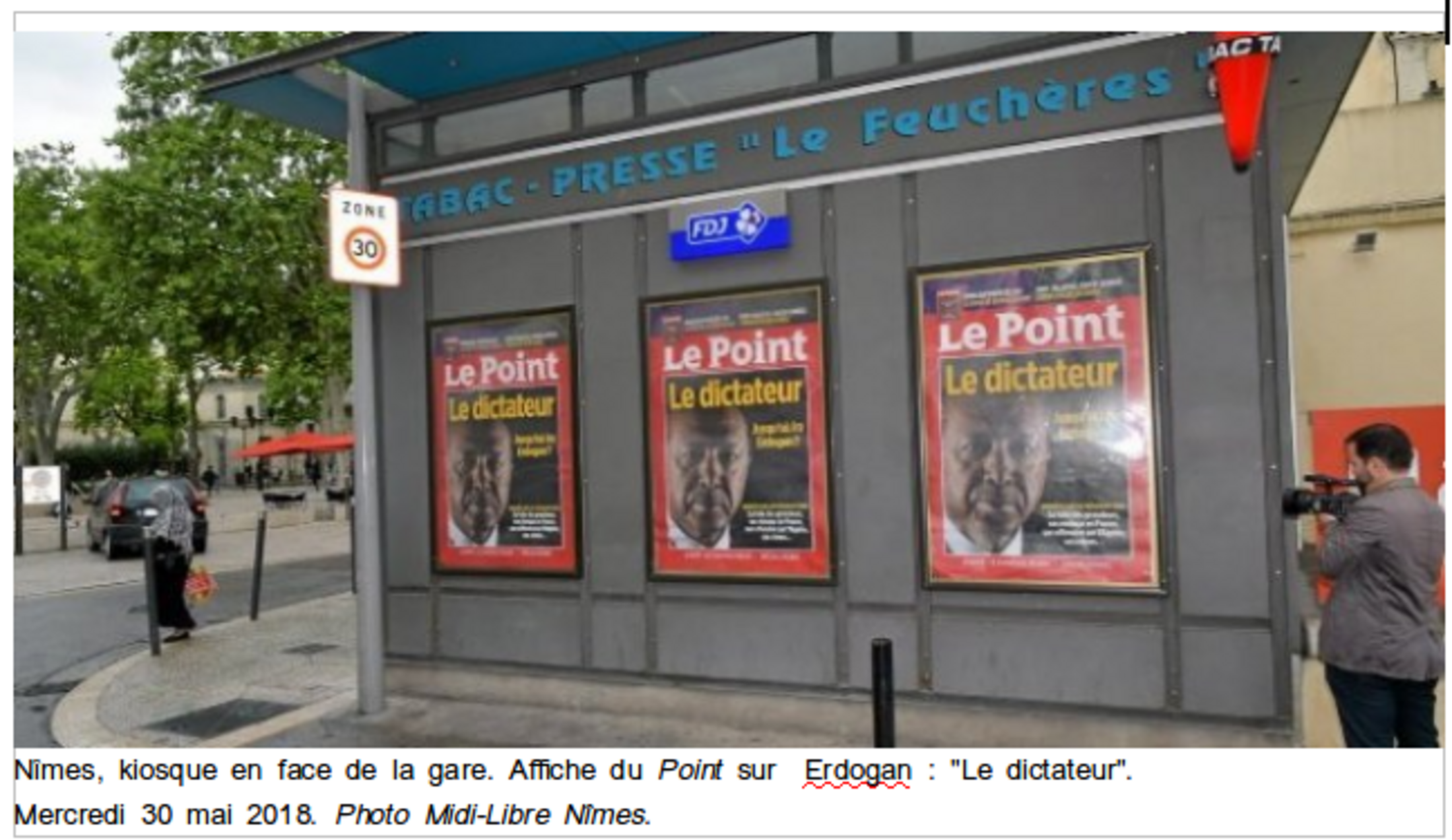 Hier, mercredi 30 mai, un ressortissant turc a menacé le kiosquier près de la gare de Nîmes pour qu’il enlève les trois affiches de la"une" du Point montrant la photo du président turc Erdogan titrée : "Le dictateur".