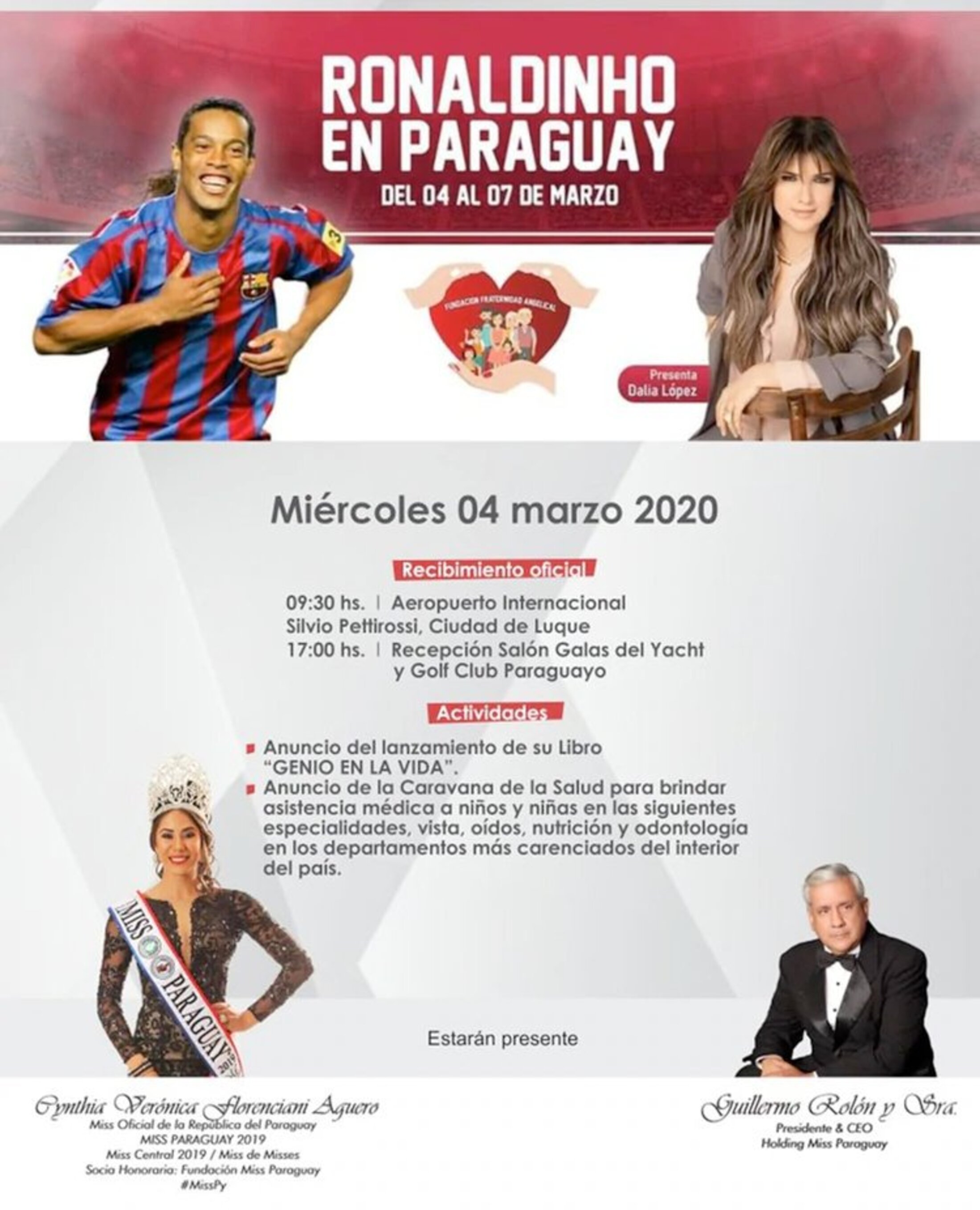 Ronaldinho devait participer à l'inauguration d'une œuvre charitable le 4 mars 2020 au Paraguay et à la présentation de son livre.