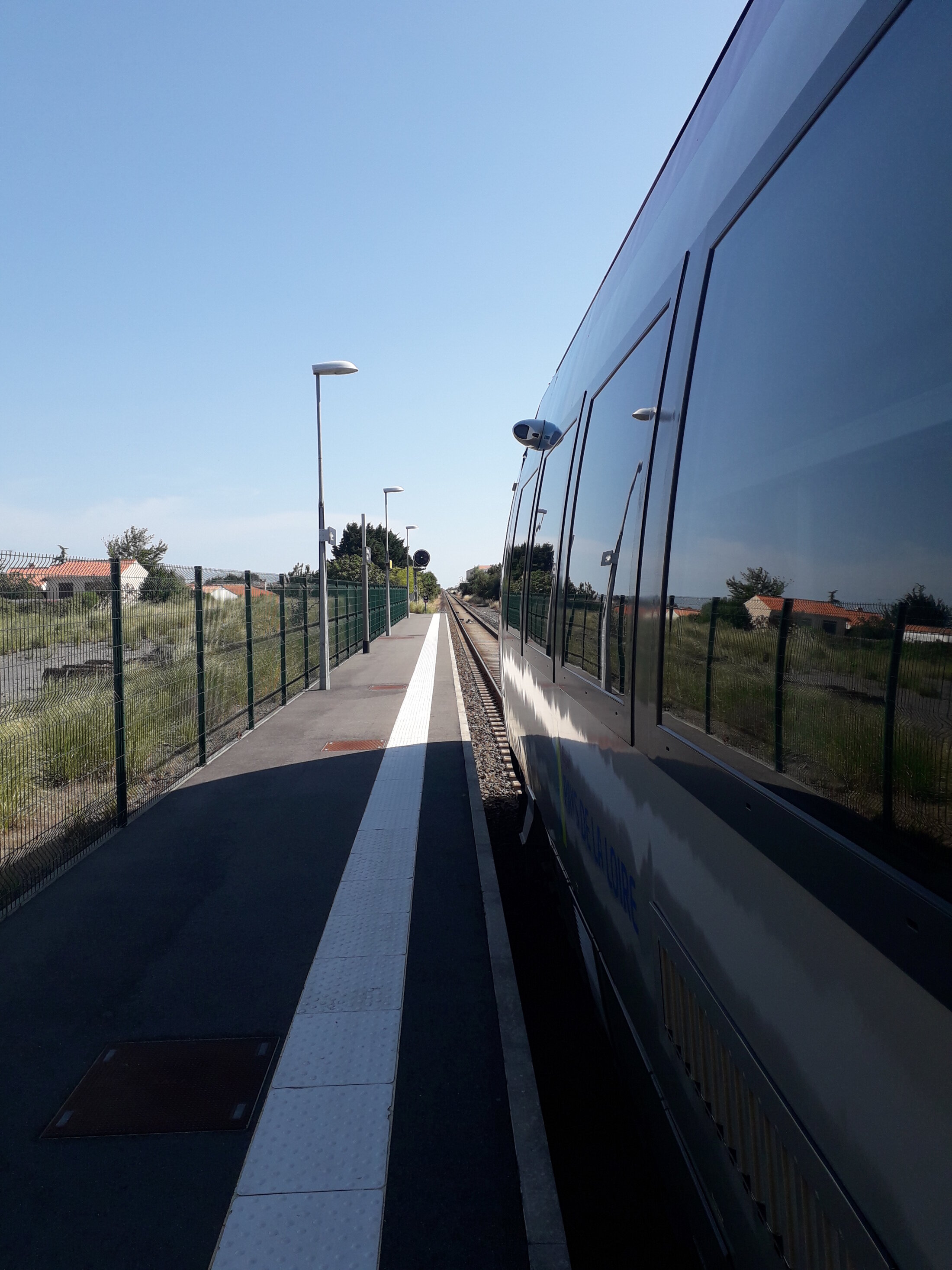 Depuis Nantes le train est bien rempli, a écouter les conversations des gens certains doivent le prendre tous les jours pour aller travailler a Nantes ou a Challans ( la ville qui se développe) ,le paysage est quelconque , cependant le vecteur transport est neuf, rapide et confortable , mais visiblement beaucoup d'usagers ne doivent pas savoir, ou comprendre comment fermer efficacement un WC de l'intérieur dans un train . sur 1h10 de voyage 4 personnes se sont fait piéger ''Houps''