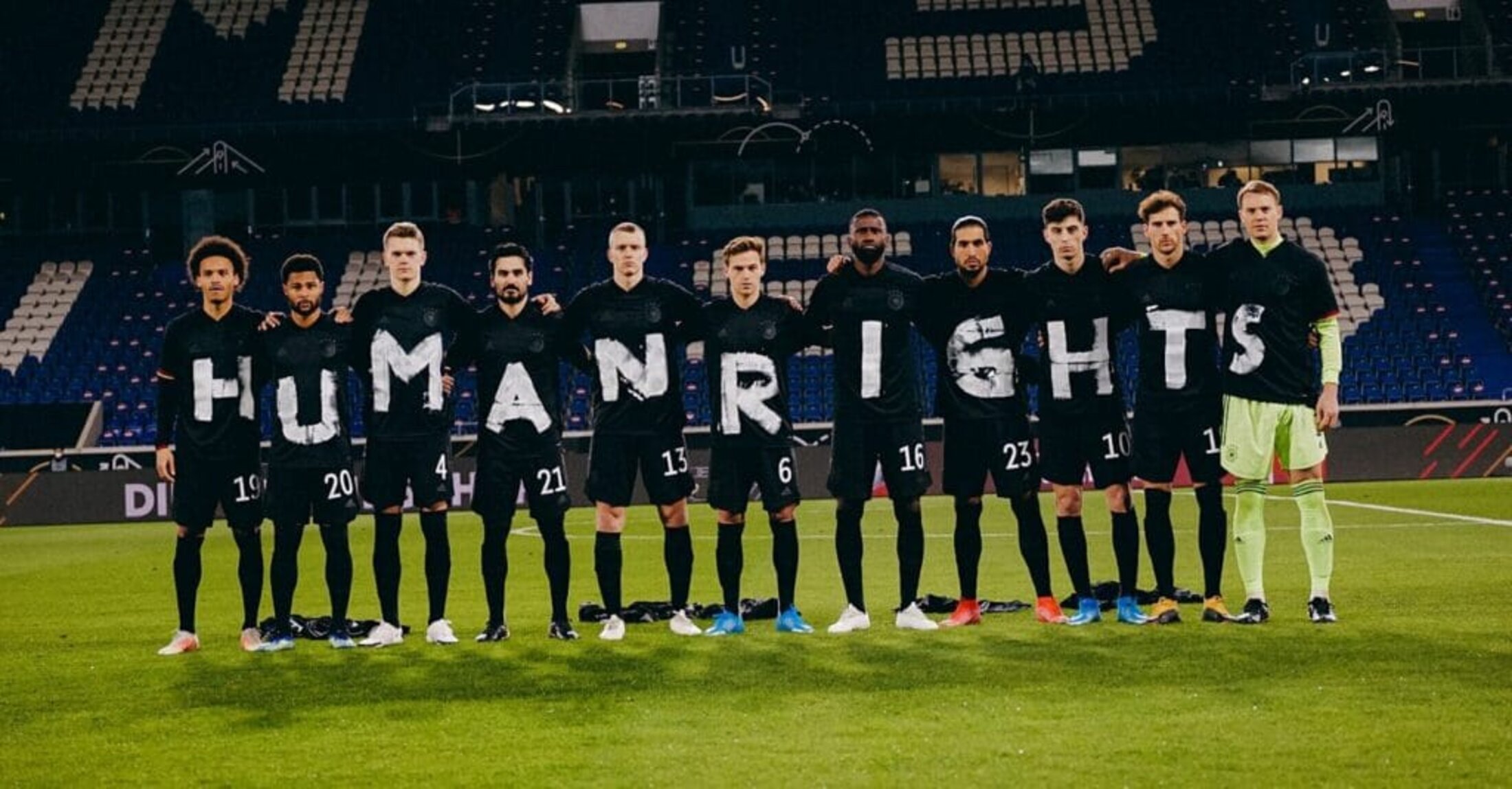 A l'occasion du match de football Islande Allemagne, les joueurs de l'équipe d'Allemagne se sont présentés avec des maillots floqués chacun d'une lettre et l'on pouvait ainsi lire "HUMANRIGHTS" au regard du scandale de l'organisation de la coupe du monde au Qatar.