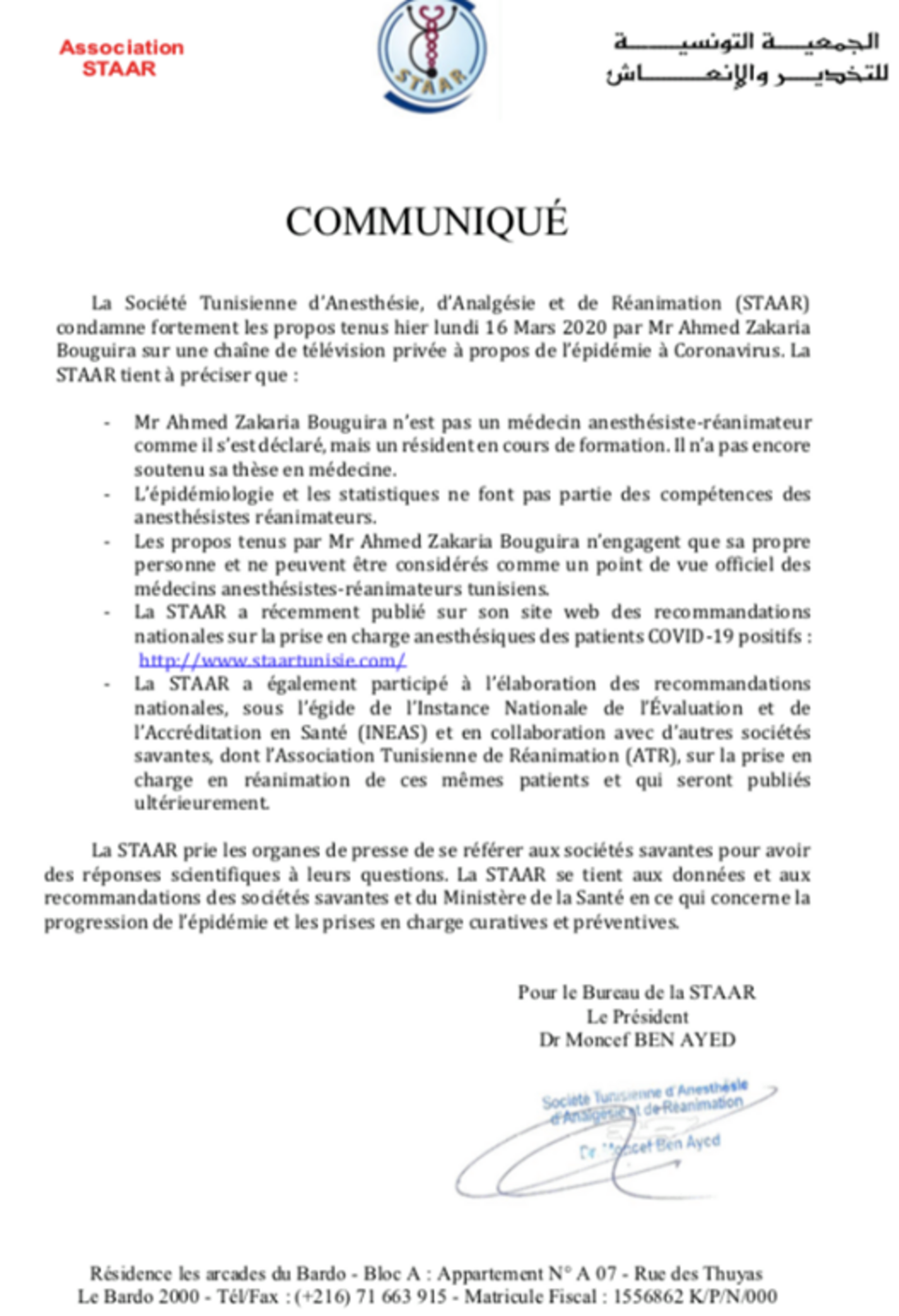 Des pressions ont été faites et le jour meme des communiqués de la Société Tunisienne d’Anesthesie, d’Analgésie et de Réanimation (STAAR) et du Conseil de l’Ordre Des Médecins de Tunisie sont sortis allant jusqu’à me menacer de sanctions disciplinaires et pénales.