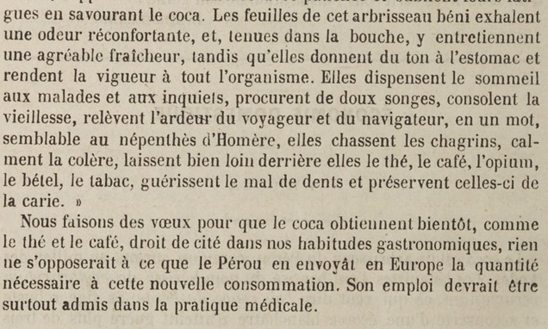 Ces recettes (je suis sympa je vous en mets une en entier pour que vous puissiez la refaire chez vous) sont accompagnées d’un long article décrivant la plante et ses propriétés « remarquables » : « elles stimulent le système nerveux d’une manière analogue à l’opium, elles renferment un principe très nourrissant, car suivant les ouvriers qui en font usage, ils peuvent, par ce secours, se passer longtemps de toute nourriture, même en se livrant à un travail assez rude. »