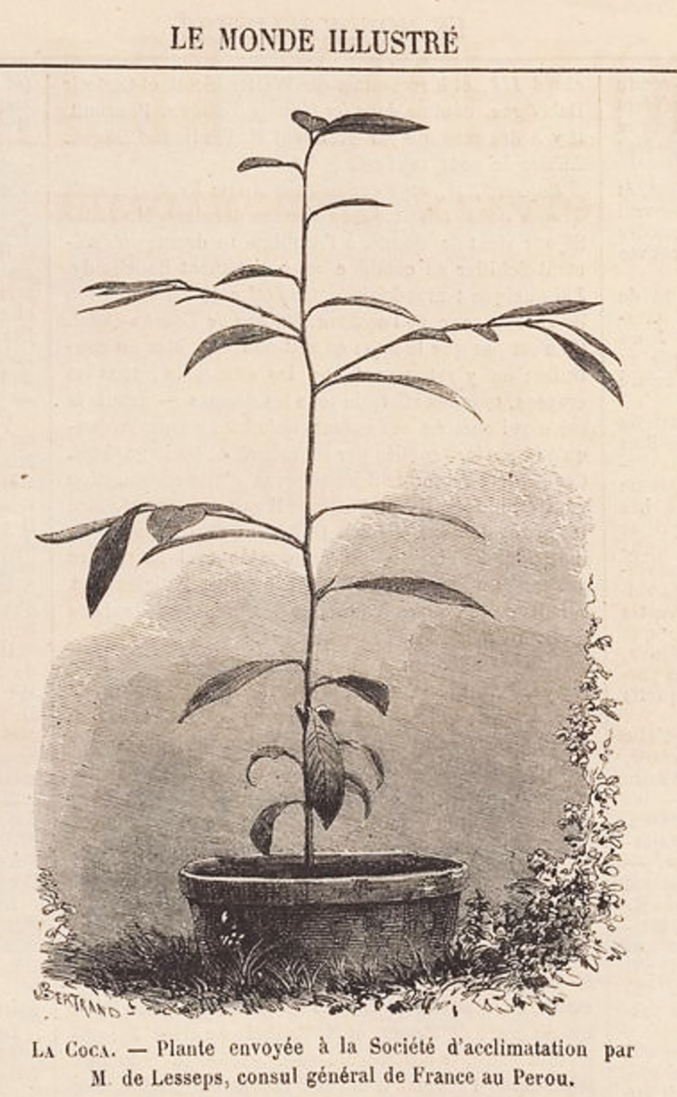 L’article commence par ces mots : « Il existe, par-delà l’Atlantique, un petit et bien humble arbrisseau [...] dont les propriétés sont tellement merveilleuses, que garder le silence à son égard serait, de la part du Monde illustré, un crime de lèse-humanité ».