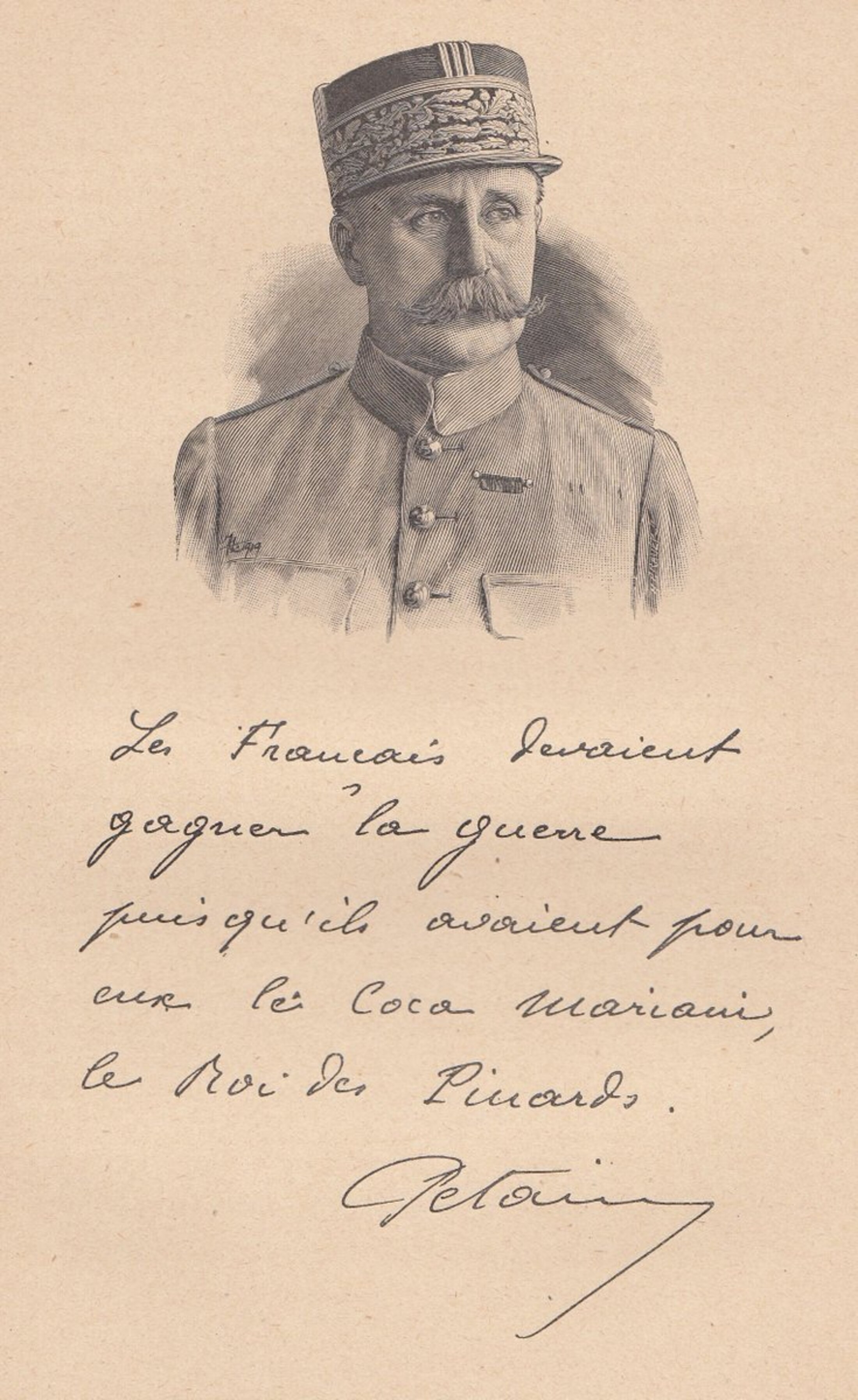 Le vin Mariani était consommé par les plus grandes personnalités de l’époque, qui en faisaient la réclame à la demande de Mariani, précurseur des méthodes de publicité modernes. On retrouve notamment Sarah Bernhardt, Frédéric Mistral, Colette, Rodin, Thomas Edison, Émile Zola, des papes, des souverain·es. Le maréchal Pétain envoie par exemple cette note : « Les Français devaient gagner la guerre, puisqu’ils avaient pour eux le Coca Mariani, le Roi des Pinards ».