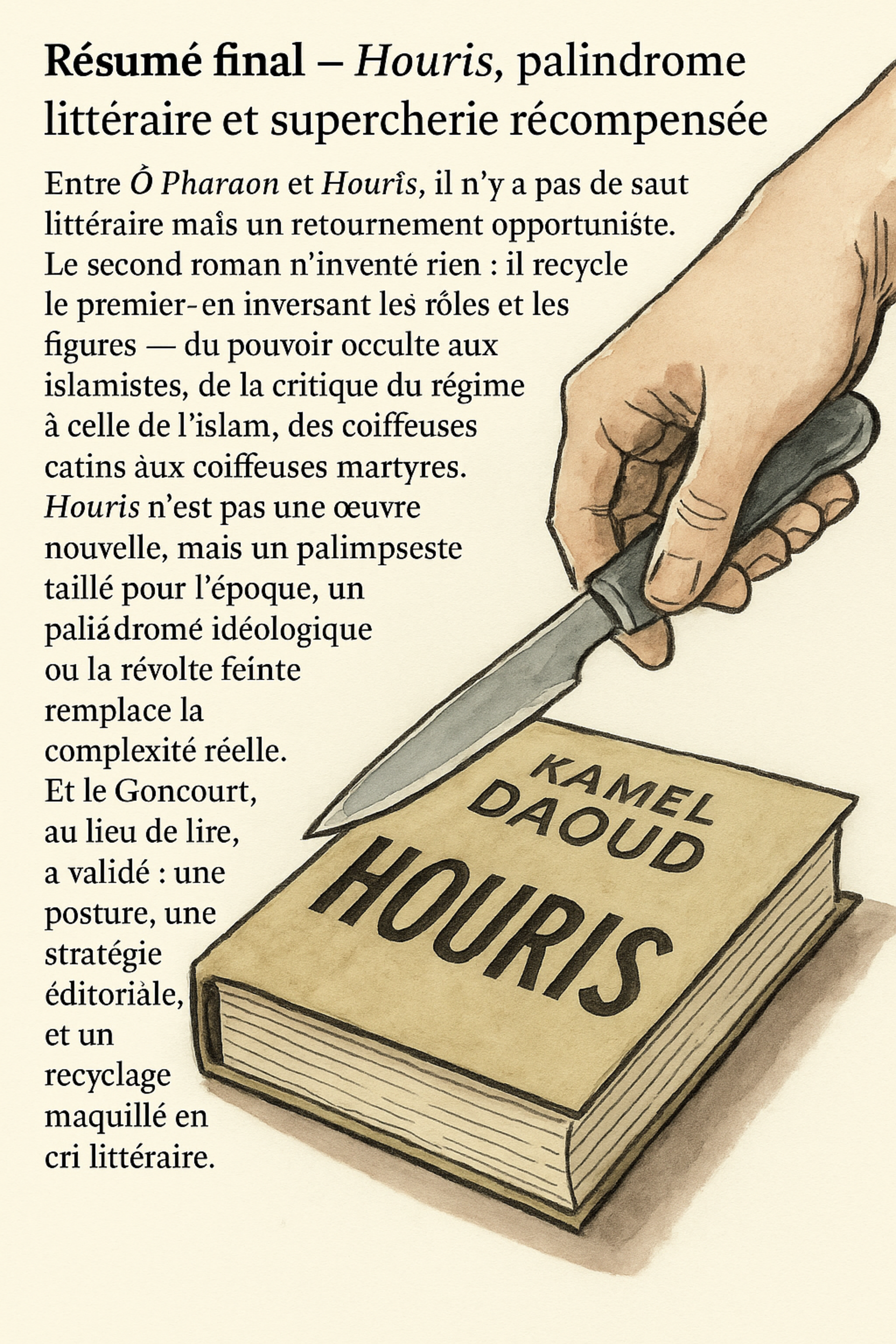 Le plus troublant n’est pas tant la redite que le travestissement : Daoud vampirise son propre texte pour mieux coller à l’air du temps et aux attentes françaises. Ainsi, Houris n’est pas une œuvre neuve — c’est un remake opportuniste, où la souffrance d’un pays est recyclée en packaging littéraire.